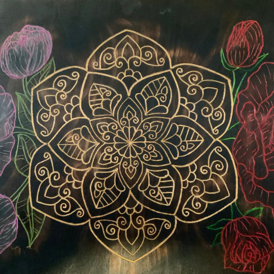 Mandala with Roses Peonies Carved Wood Burned and Painted | Framing Option Available