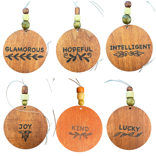 Christmas Tree Ornaments with Wood-Burned Letters and Positive Words