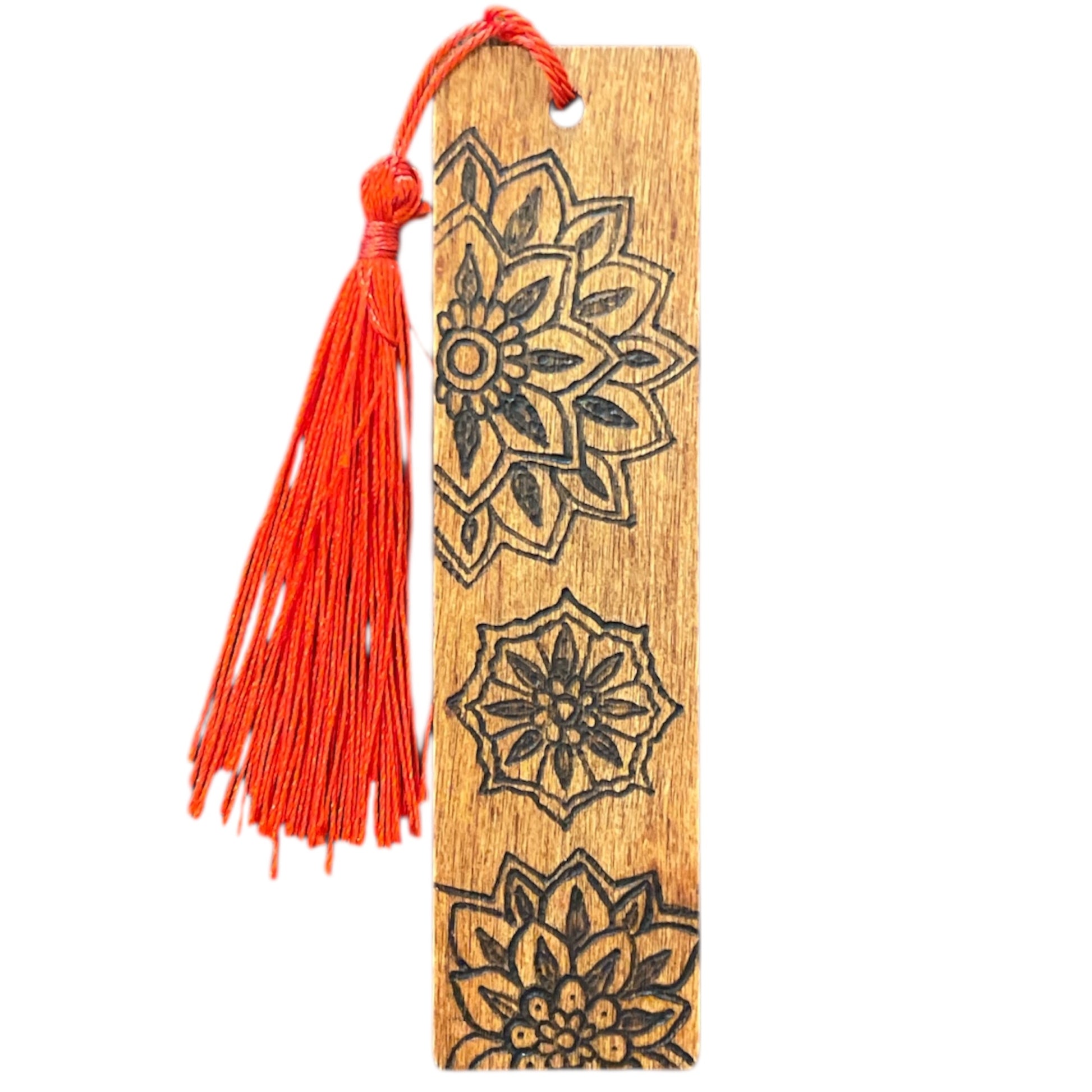 Handcrafted wood-burned bookmarks featuring inspiring words and intricate designs. Each 4.5" wooden bookmark is finished with a rich wood stain and topped with a stylish tassel perfect for book lovers and thoughtful gifting.