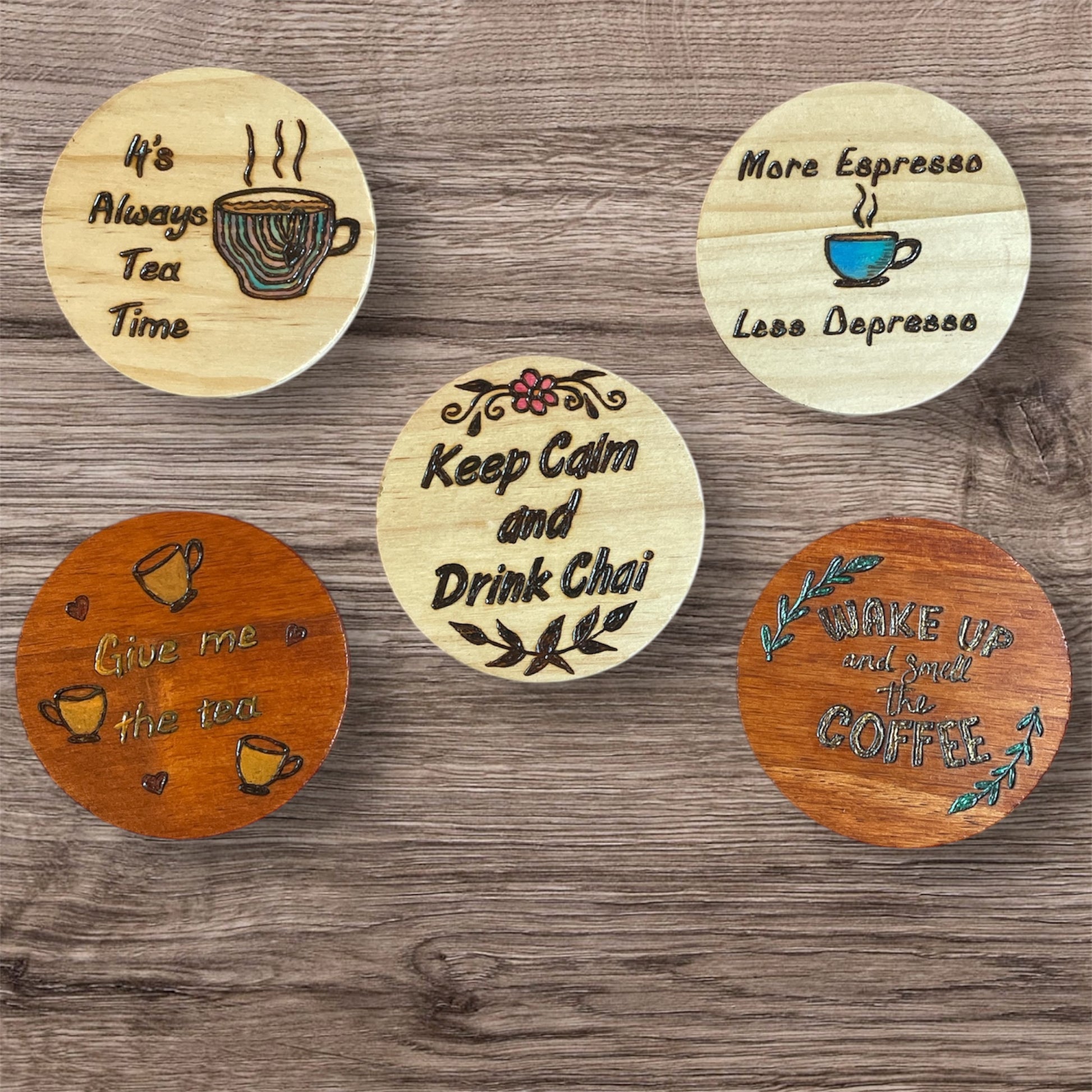 Add a touch of art to your home or office with these handcrafted wooden coasters, featuring one-of-a-kind wood burned designs and quotes. Perfect as a gift or for personal use, each coaster is sealed with a durable polyurethane coating to protect against scratches and water stains. Crafted with love, care, and attention to detail, these coasters provide both beauty and functionality for your space. Wholesale/bulk orders welcome. Contact us for special pricing.