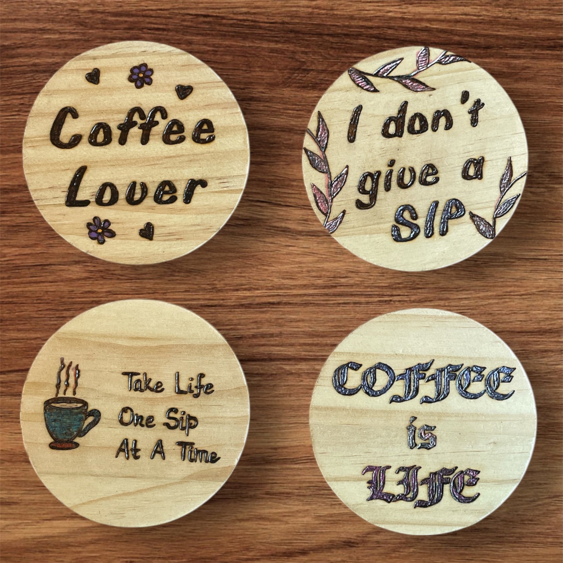 Add a touch of art to your home or office with these handcrafted wooden coasters, featuring one-of-a-kind wood burned designs and quotes. Perfect as a gift or for personal use, each coaster is sealed with a durable polyurethane coating to protect against scratches and water stains. Crafted with love, care, and attention to detail, these coasters provide both beauty and functionality for your space. Wholesale/bulk orders welcome. Contact us for special pricing.